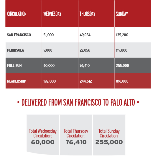The San Francisco Examiner is the highest circulated newspaper in San Francisco and San Mateo Counties. On Sunday with a circulation of 255,000, the SF Examiner has more than 3.5 times the market penetration than any other newspaper publication in the counties we serve. That means you are reaching the most affluent readers in the San Francisco area while they are at home and have the time to read and make buying decisions.